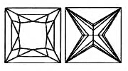 The PRINCESS CUT diamond is a square cut diamond with 90 degree angles on each corner. It has a tremendous amount of brilliance, second only to rounds. Princess cut diamonds have become increasingly popular within the past few years. The princess cut can vary greatly in how square or rectangular they are. For a square shape, look for a length to width ratio between 1.00 and 1.10. For a rectangle, look for a ratio between 1.50 and 2.00. Table should be between 65-80% and the depth between 65-75%.